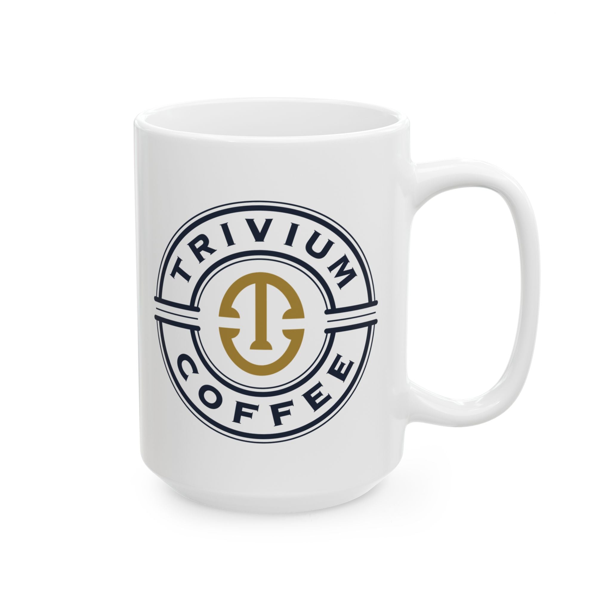 Crisp white ceramic with a high-gloss finish and bold Trivium logo